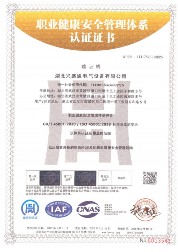 职业健康安全管理体系认证证书