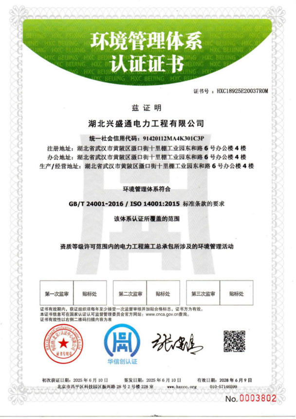 环境管理体系认证证书