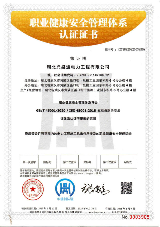 职业健康安全管理体系认证证书